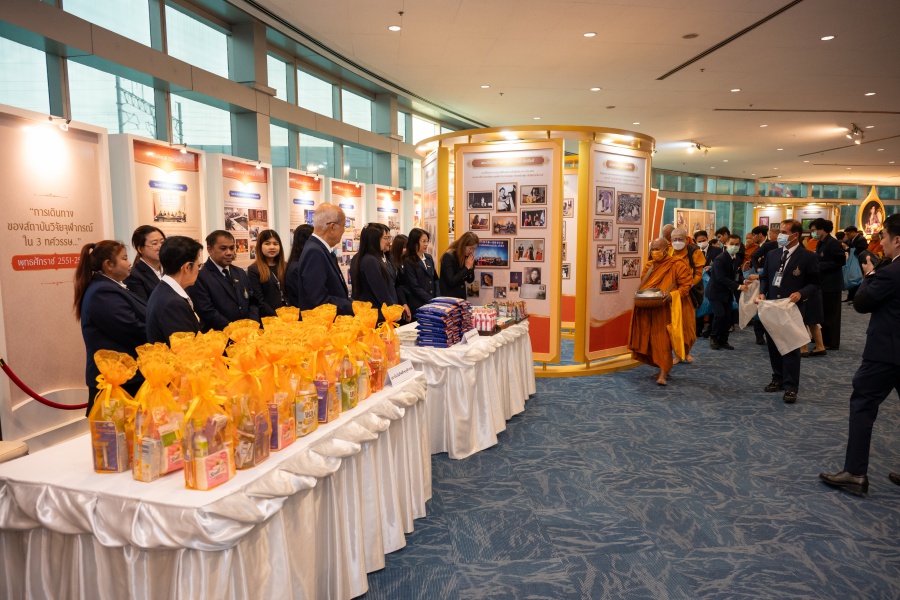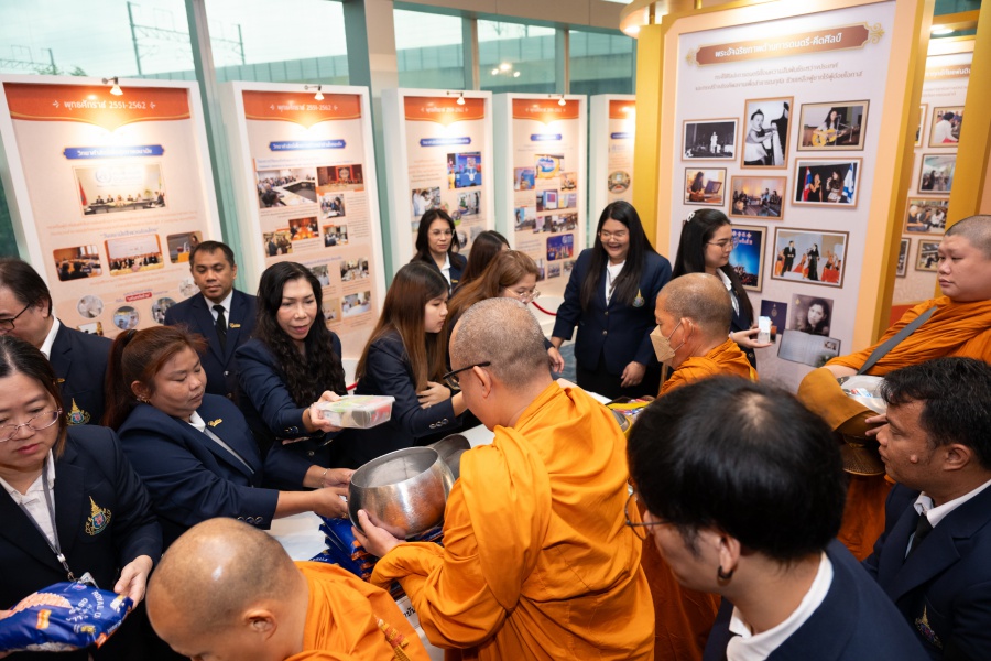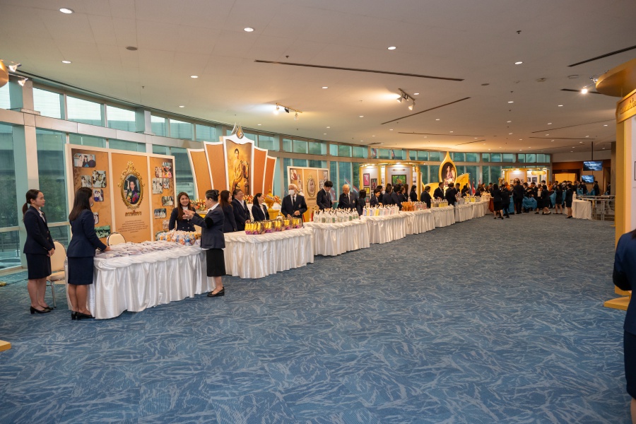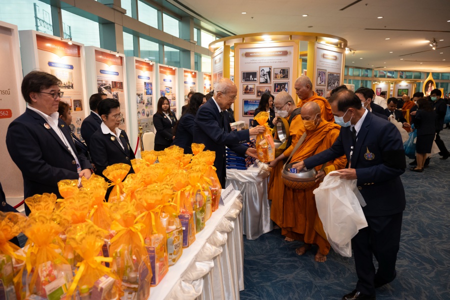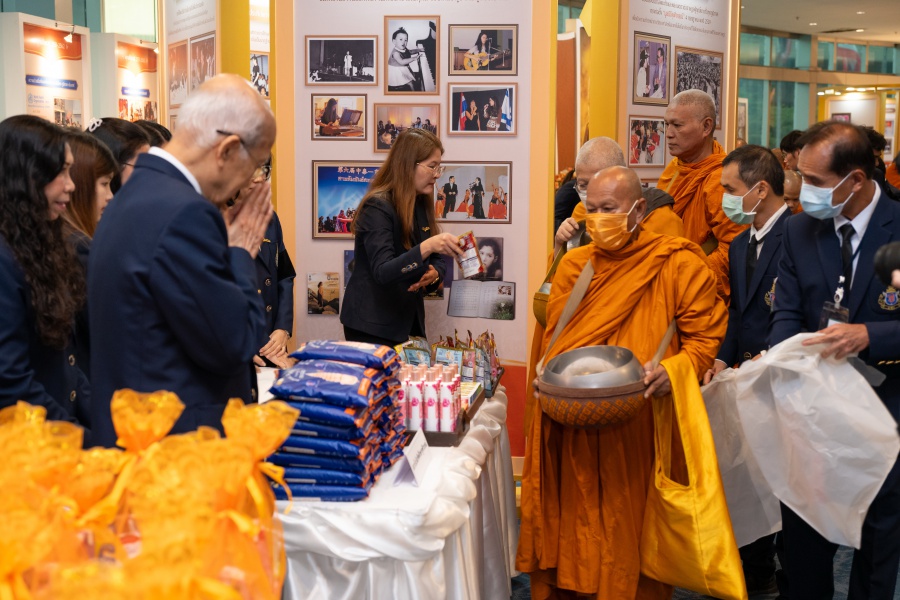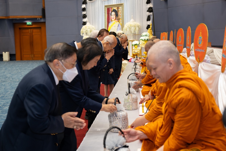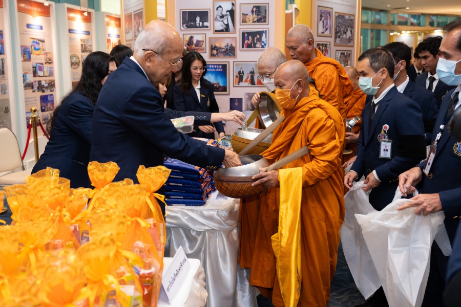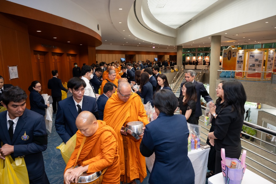 The event started with offering alms to a total of 29 Buddhist monks from Wat Lak Si and Wat Si Kan (Buddha Siam) to make merit for and commemorate the passing of the Queen Mother at the main hall on the second floor of the Convention Center Building of Chulabhorn Research Institute.