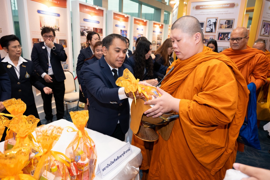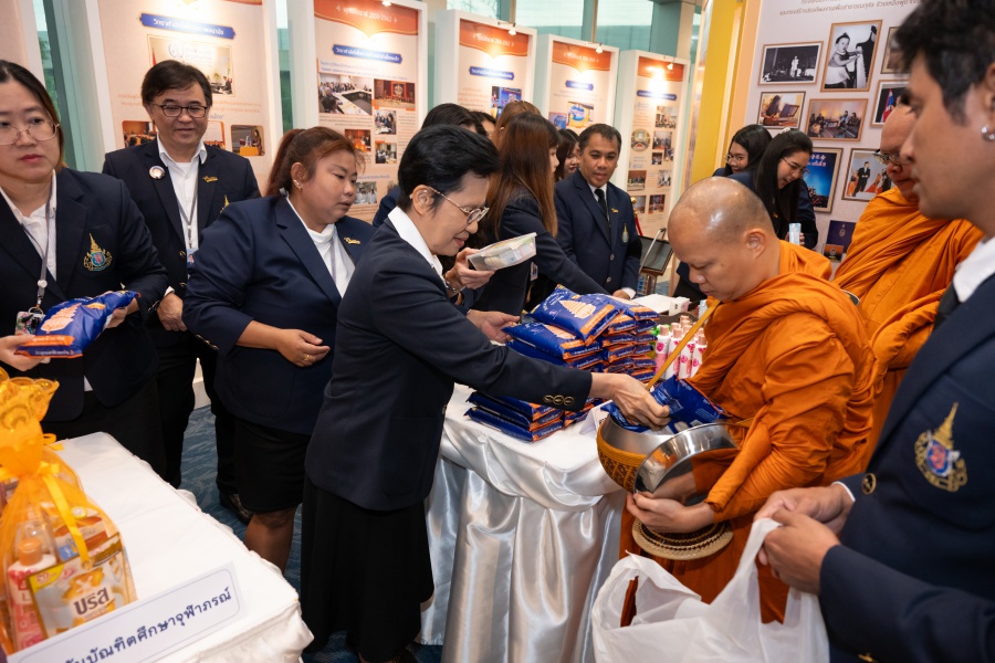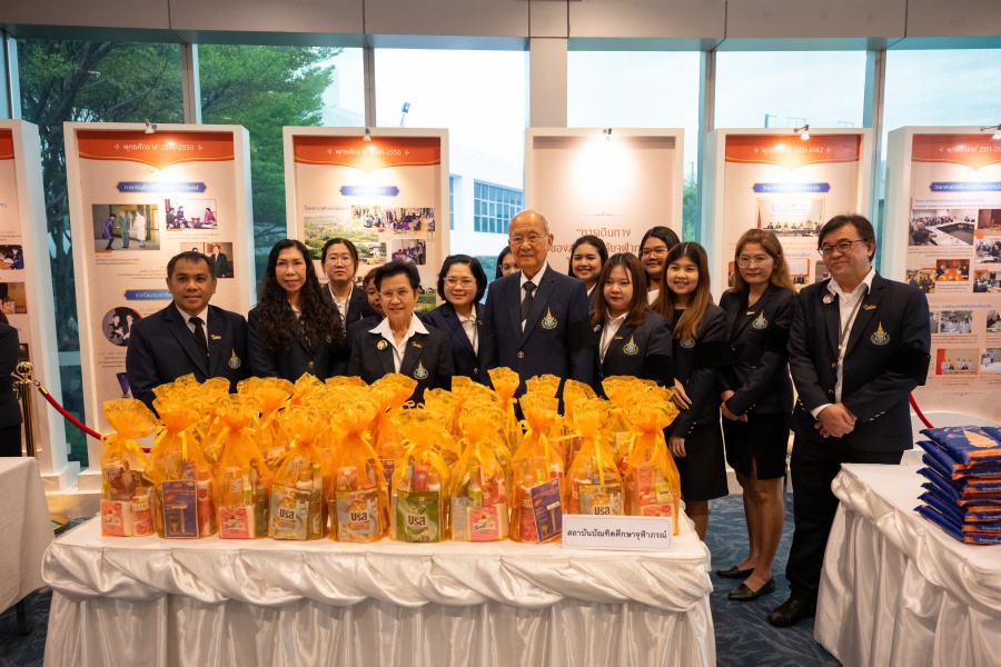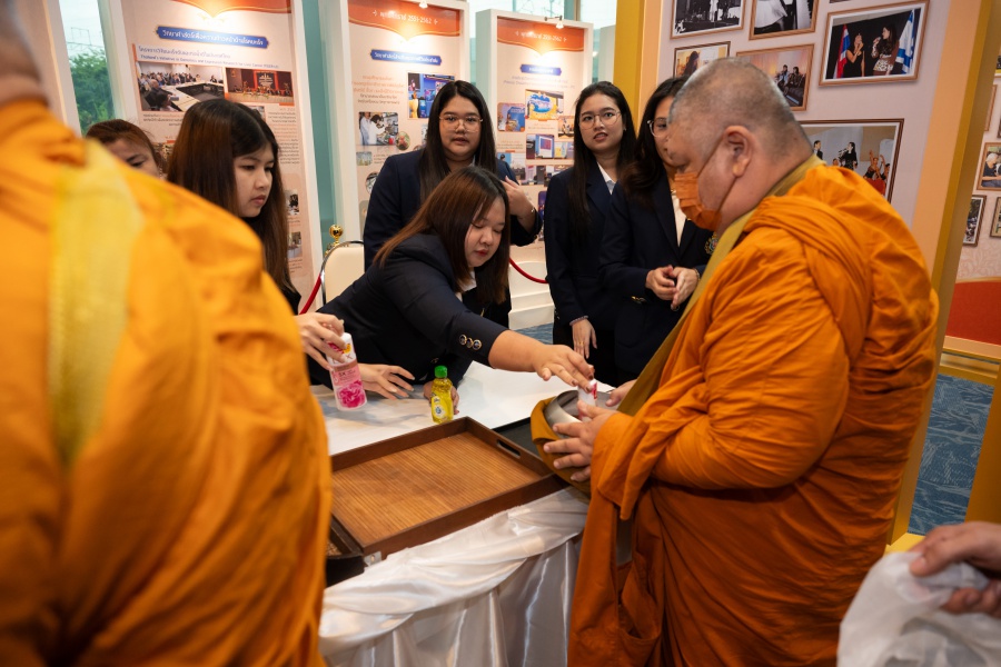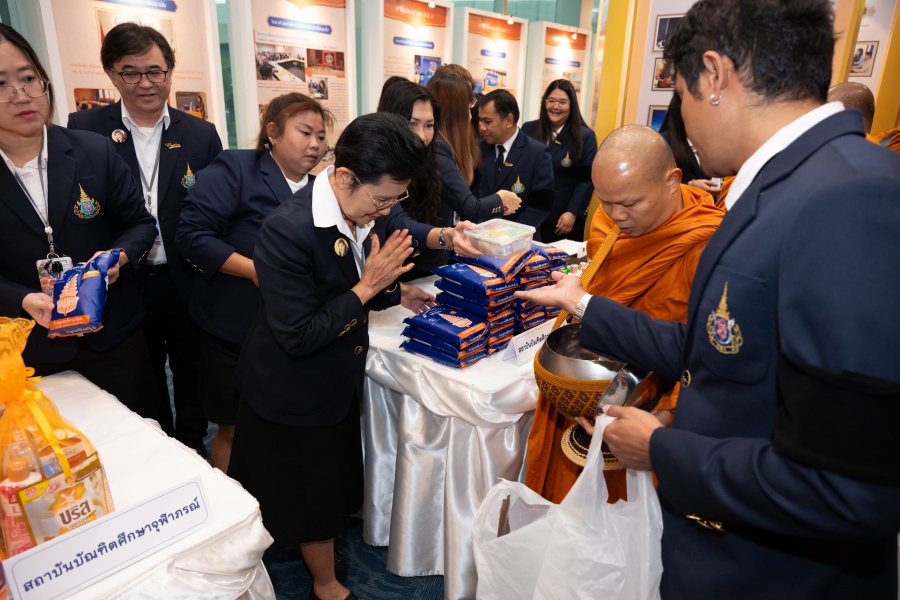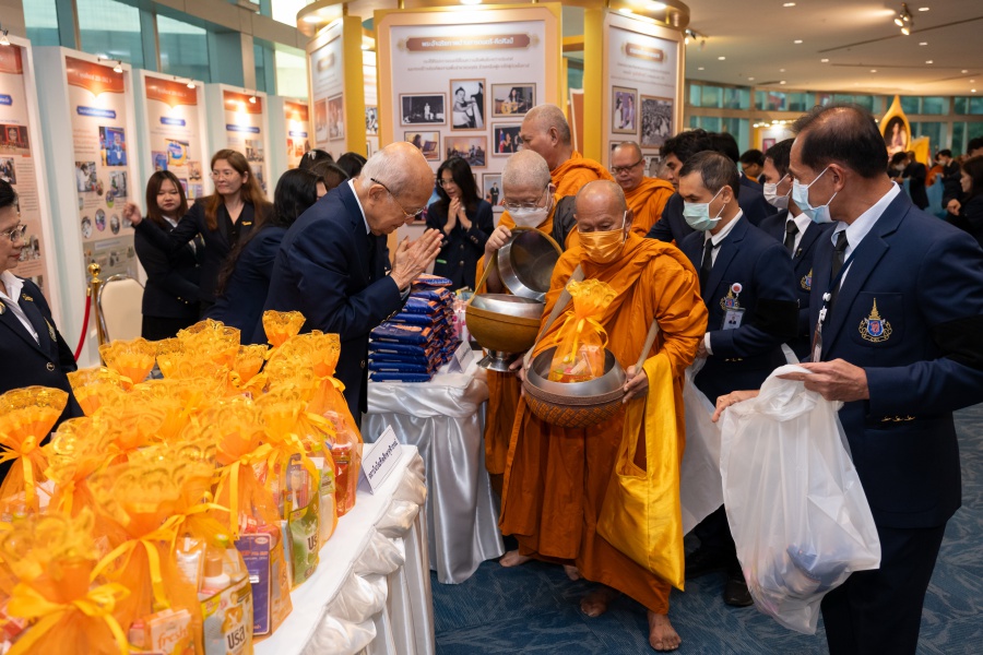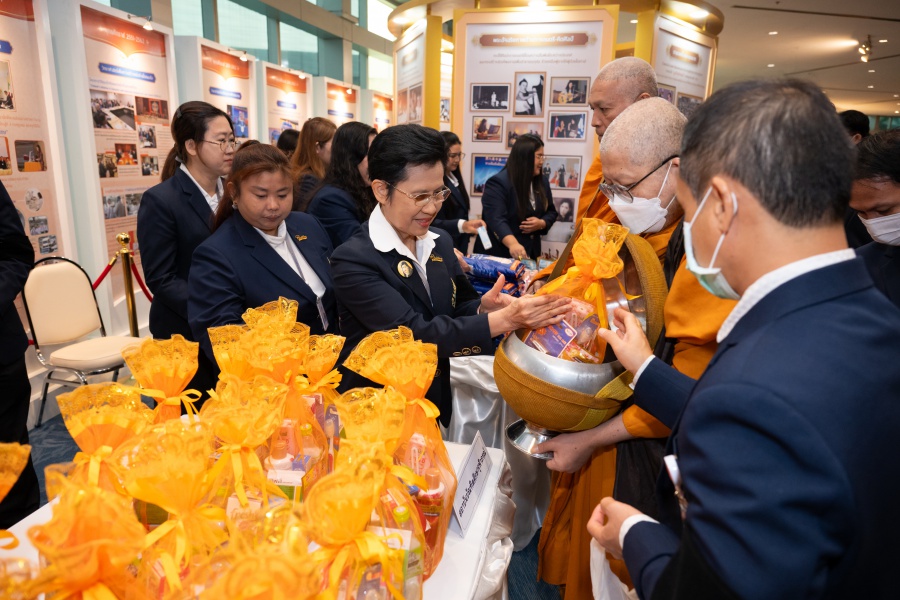 The event started with offering alms to a total of 29 Buddhist monks from Wat Lak Si and Wat Si Kan (Buddha Siam) to make merit for and commemorate the passing of the Queen Mother at the main hall on the second floor of the Convention Center Building of Chulabhorn Research Institute.