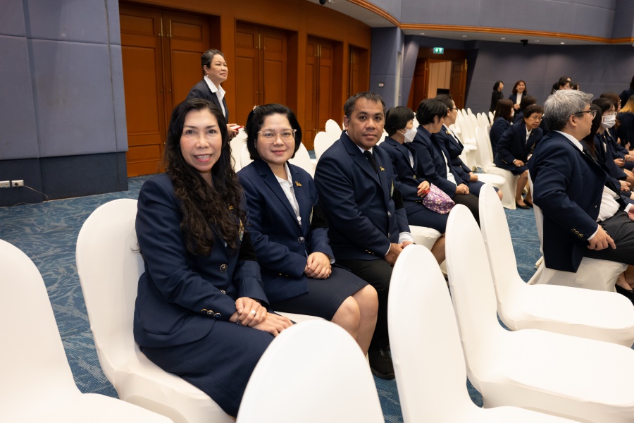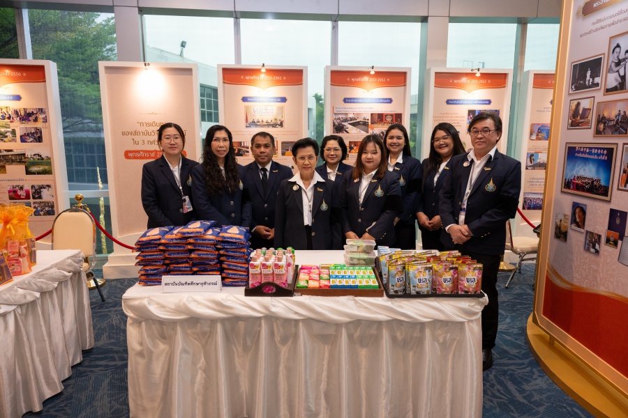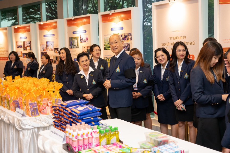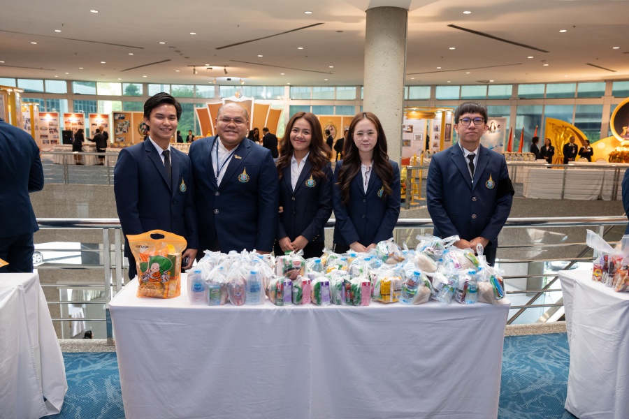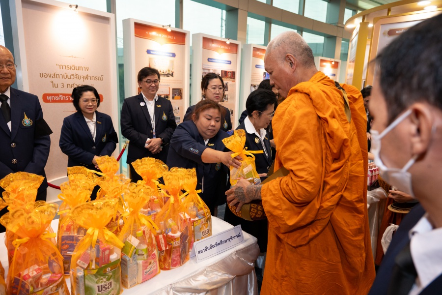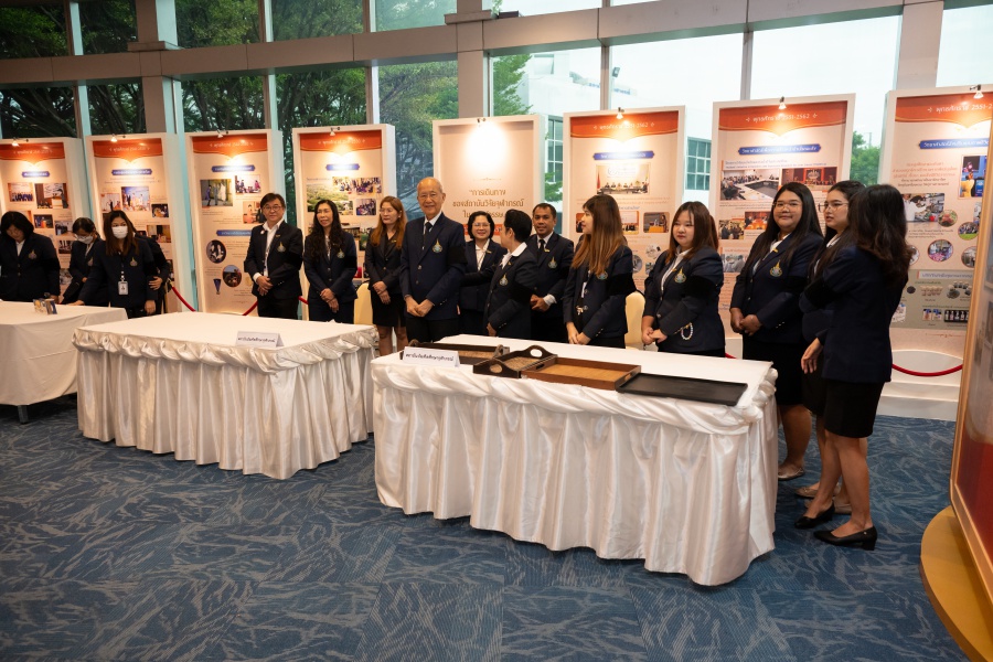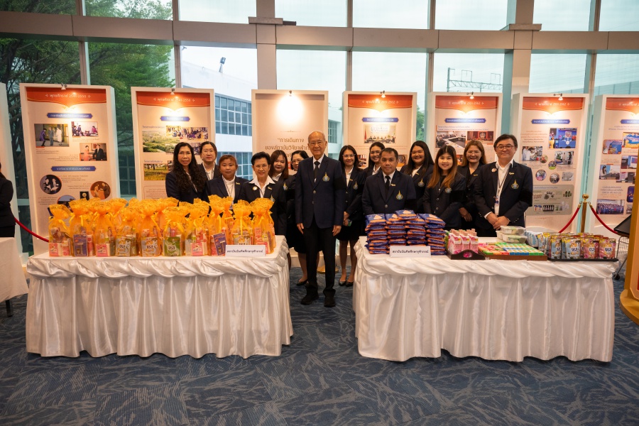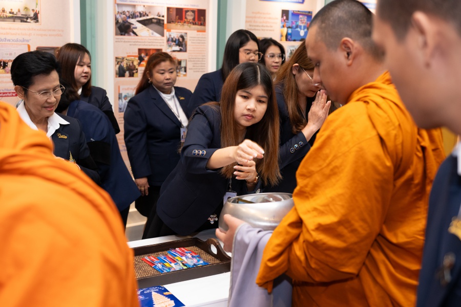 The event started with offering alms to a total of 29 Buddhist monks from Wat Lak Si and Wat Si Kan (Buddha Siam) to make merit for and commemorate the passing of the Queen Mother at the main hall on the second floor of the Convention Center Building of Chulabhorn Research Institute.