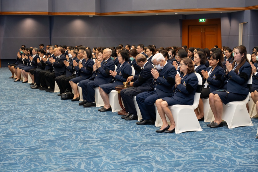 Then, the chairperson lighted the incense sticks and candles to worship the Triple Gems and lighted the candles at Kruang Thong Noi (a small set of gold-plated ceremonial utensils) in front of the royal picture of Her Majesty Queen Sirikit The Queen Mother at the Convention Center Chulabhorn Research Institute. After that the ceremony chairperson presented a memorial tribute to Her Majesty Queen Sirikit The Queen Mother and invited the participants in the ceremony to stand in silence for 93 seconds. Finally, 10 Buddhist monks from Wat Phra Borommathat Woramahawihan chanted Buddhist prayers and pdrformed religious ceremony to end the event.