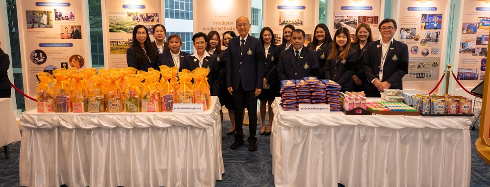 The event started with offering alms to a total of 29 Buddhist monks from Wat Lak Si and Wat Si Kan (Buddha Siam) to make merit for and commemorate the passing of the Queen Mother at the main hall on the second floor of the Convention Center Building of Chulabhorn Research Institute.