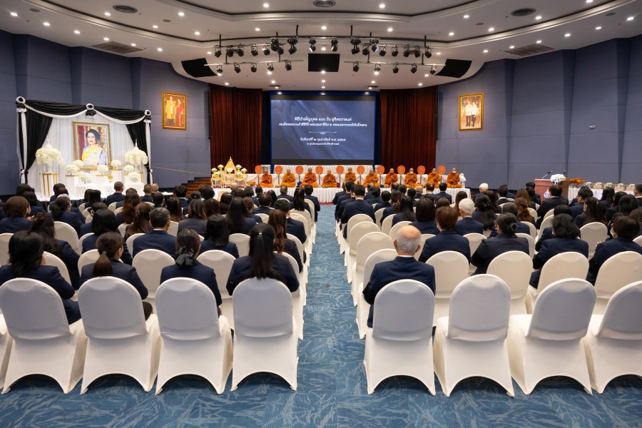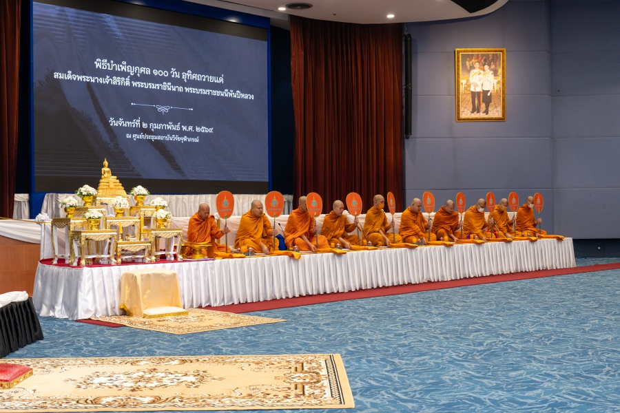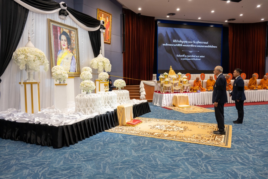 On Monday 2 February 2026 at 10:00 AM Professor Emeritus Dr. Somsak Ruchirawat, Rector of Chulabhorn Graduate Institute, led a delegation of administrators including Associate Professor Dr. Piniti Ratananukul, Vice Rector of Chulabhorn Graduate Institute, Associate Professor Dr. Thanuttkhul Mongkolaussavarat, Assistant Rector of Chulabhorn Graduate Institute, and Associate Professor Dr. Jutamaad Satayavivad, Head of the Environmental Toxicology Program, along with staff from the Institute to join the merit-making ceremony held in observance of the 100th day of the passing of Her Majesty Queen Sirikit, The Queen Mother at the Convention Hall on the second floor of Chulabhorn Convention Center. The ceremony was presided over by Associate Professor Dr. Chusak Limsakul, vice chairman for administration and buildings of Chulabhorn Research Institute, who was accompanied by the Institute’s administration team and personnel.