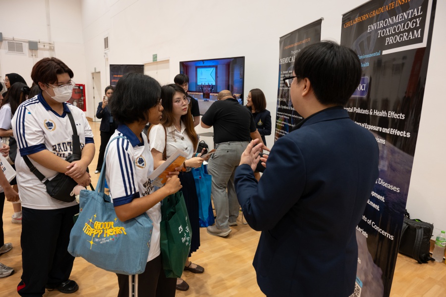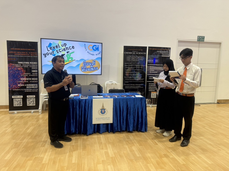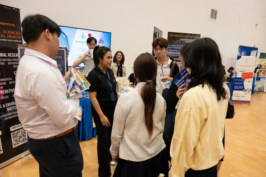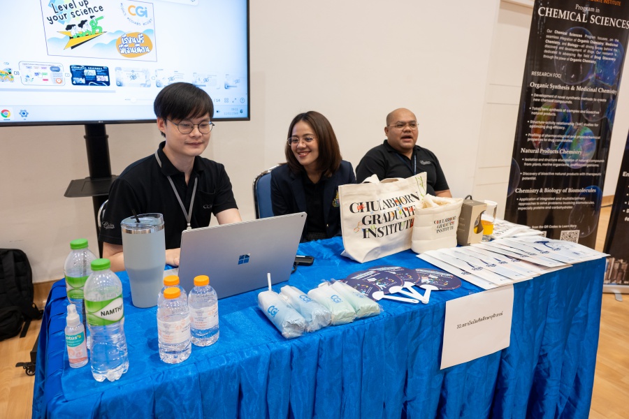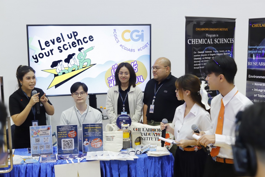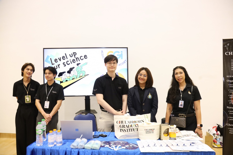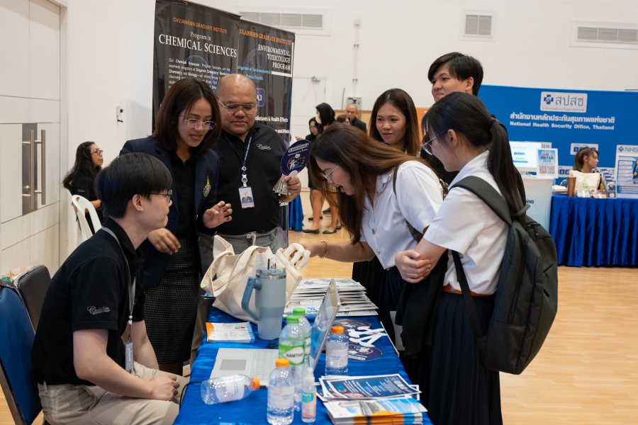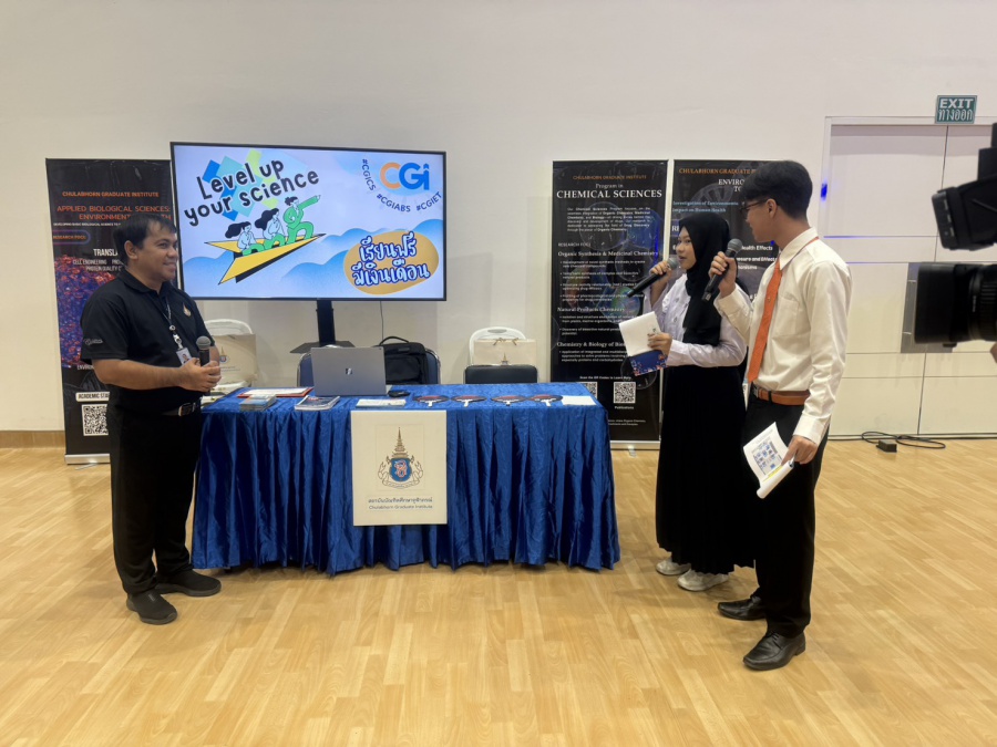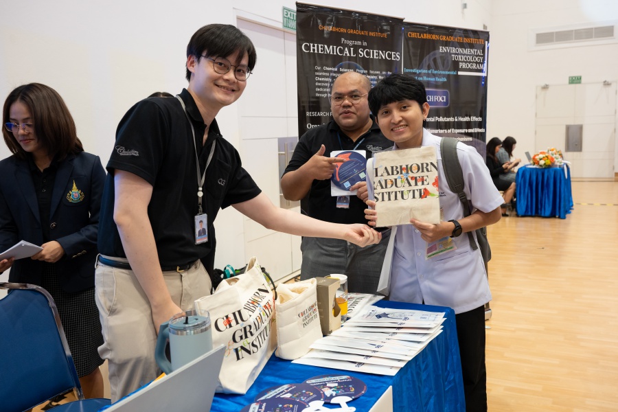 On its part, Chulabhorn Graduate Institute took part in the booth exhibition to introduce its study programs during the two-day event. The team representing the Institute included Assistant Professor Dr. Worawat Niwetmarin (Chemical Sciences Program) and Dr. Phum Tachachartvanich (Environmental Toxicology Program), together with researchers, interested personnel, as well as student representatives, who collaborated in sharing experiences and information informally and in a friendly manner on the Institute’s graduate study programs, and the outstanding features of the delivery of the three programs. Moreover, the team provided suggestions for students’ preparation for the selection of research programs of their specific interest at the Master’s and doctoral levels. The team also opened a Q&A opportunity for students participating in the event.