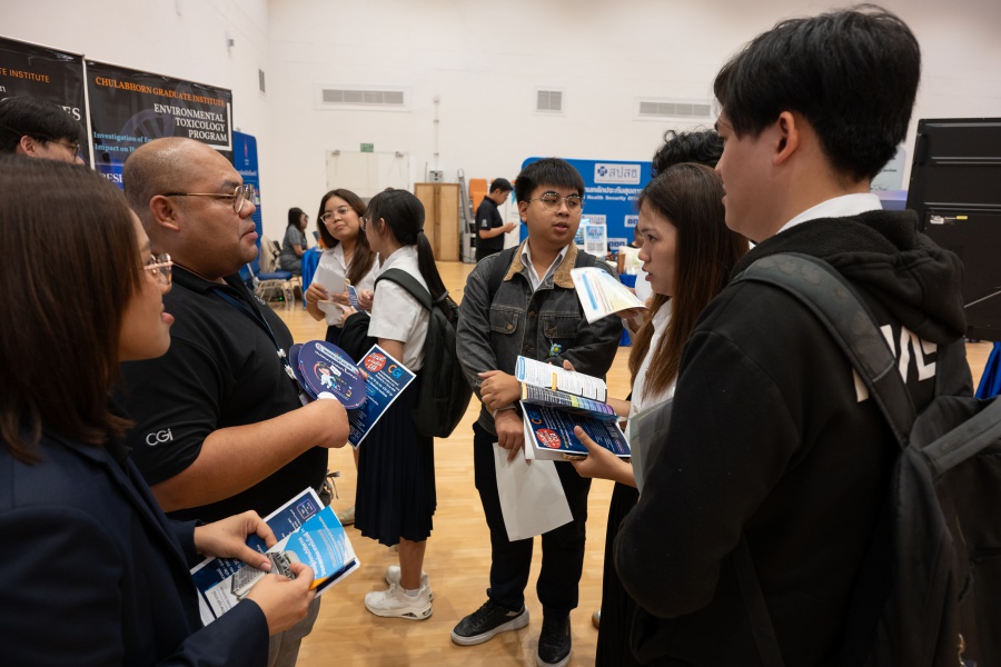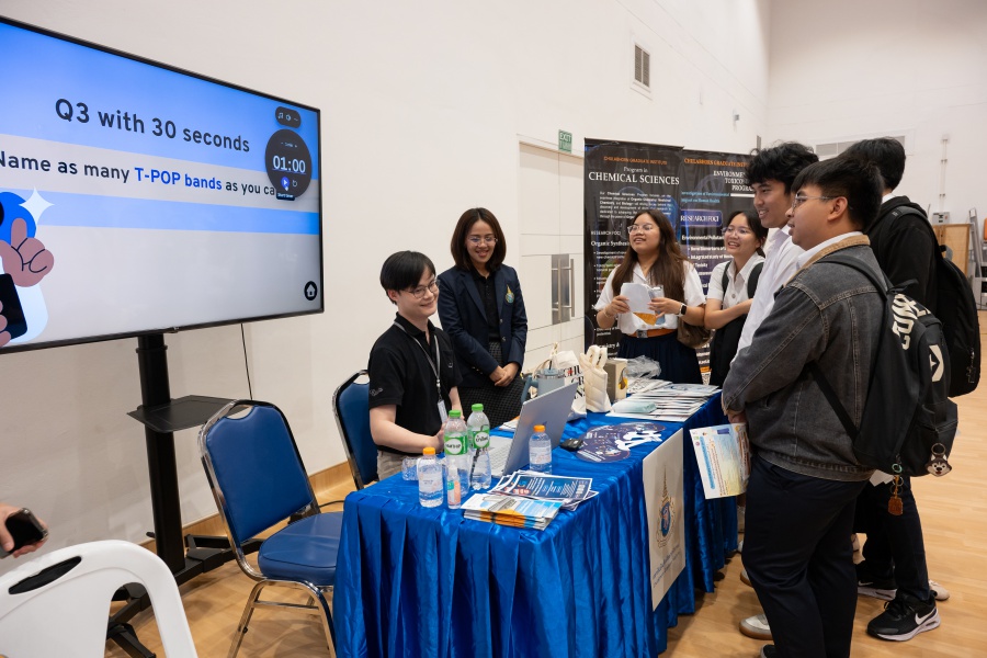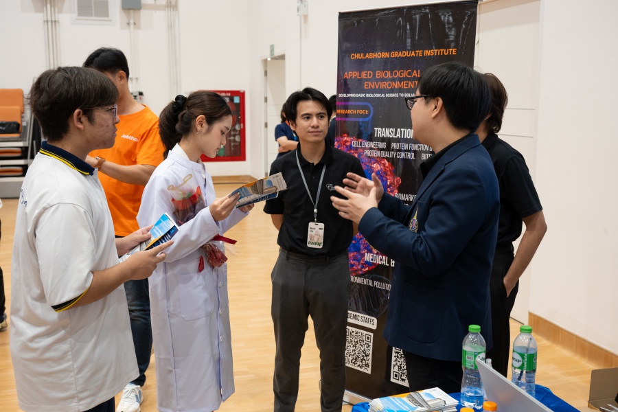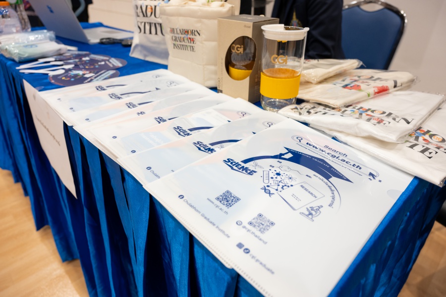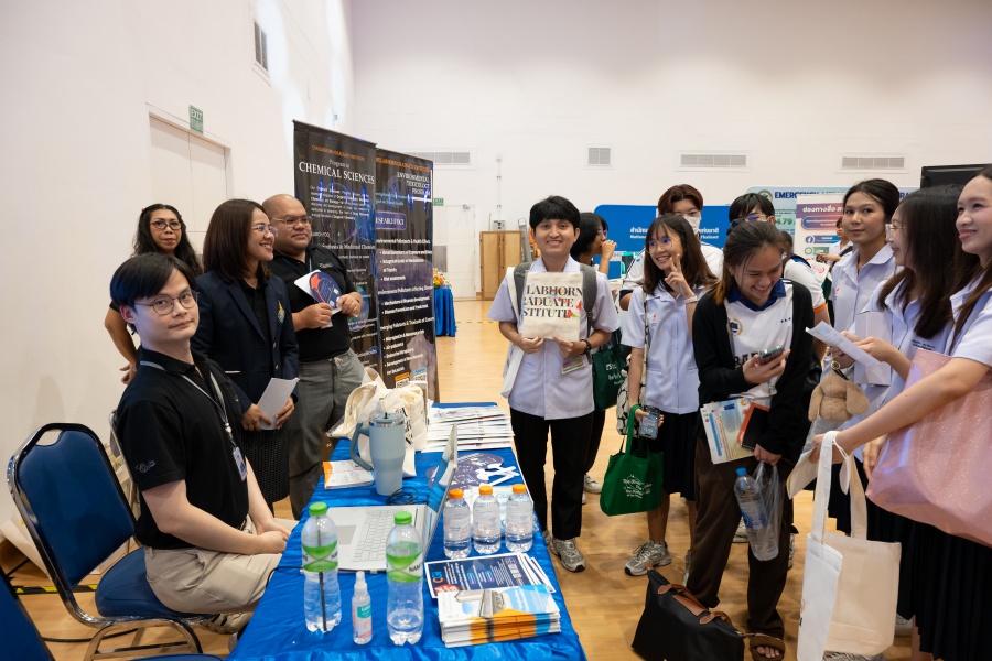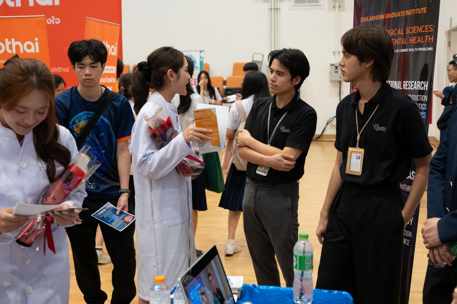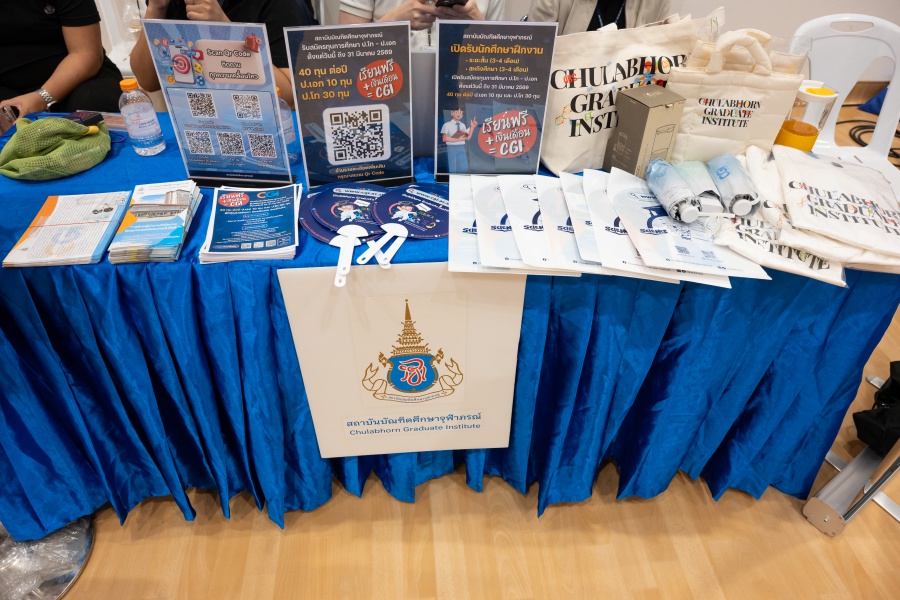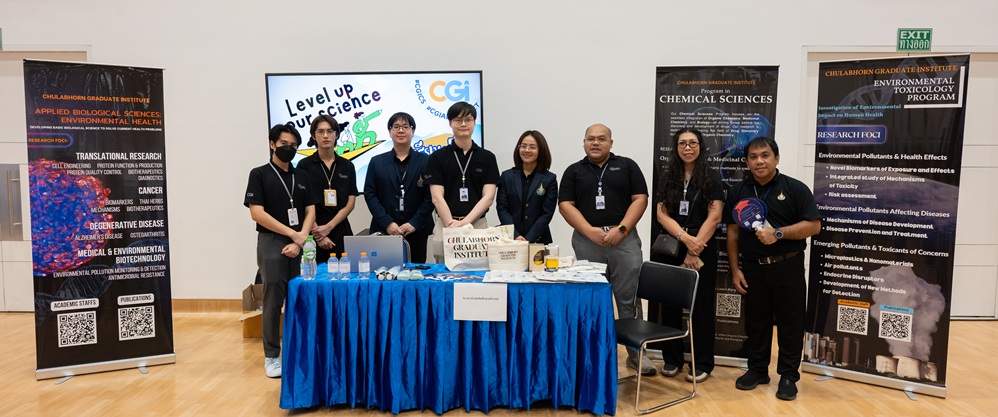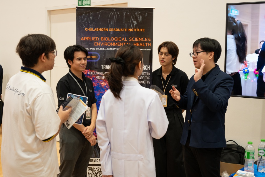 On its part, Chulabhorn Graduate Institute took part in the booth exhibition to introduce its study programs during the two-day event. The team representing the Institute included Assistant Professor Dr. Worawat Niwetmarin (Chemical Sciences Program) and Dr. Phum Tachachartvanich (Environmental Toxicology Program), together with researchers, interested personnel, as well as student representatives, who collaborated in sharing experiences and information informally and in a friendly manner on the Institute’s graduate study programs, and the outstanding features of the delivery of the three programs. Moreover, the team provided suggestions for students’ preparation for the selection of research programs of their specific interest at the Master’s and doctoral levels. The team also opened a Q&A opportunity for students participating in the event.