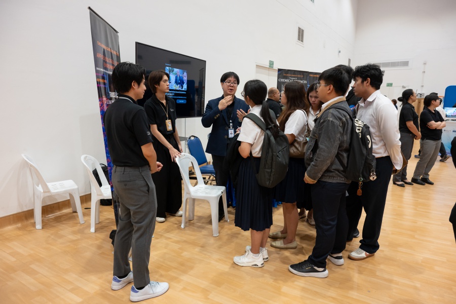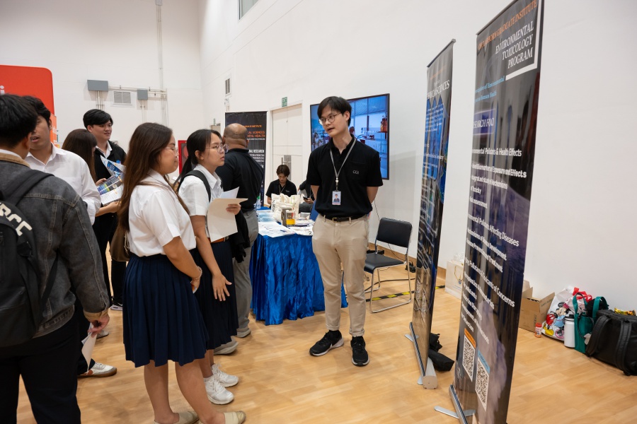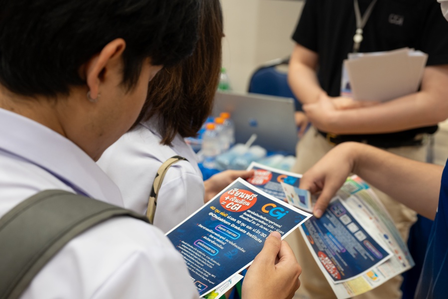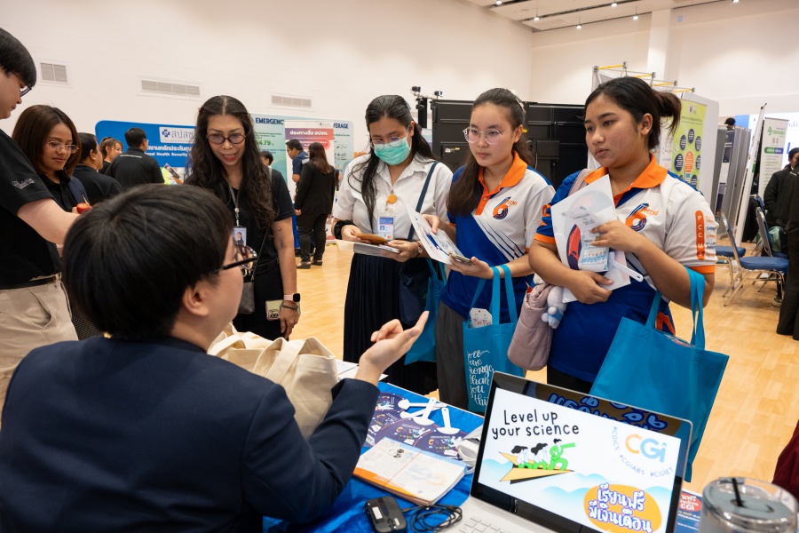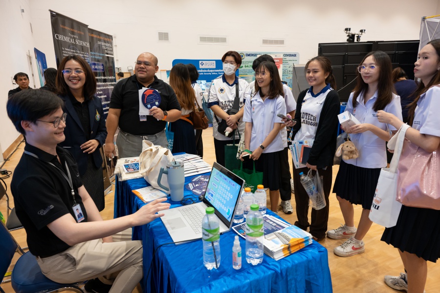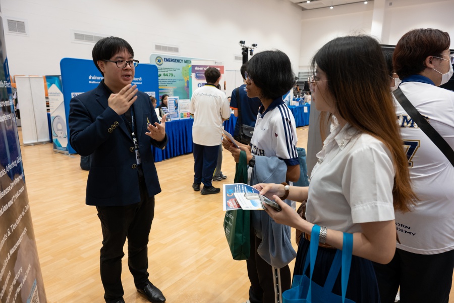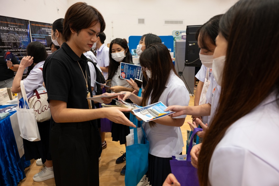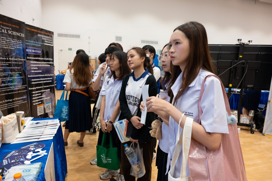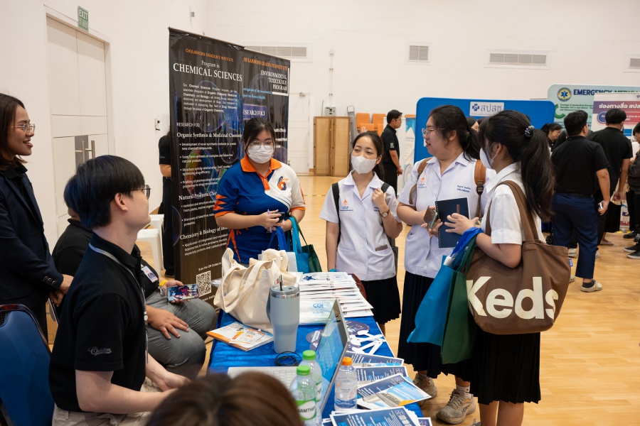 On its part, Chulabhorn Graduate Institute took part in the booth exhibition to introduce its study programs during the two-day event. The team representing the Institute included Assistant Professor Dr. Worawat Niwetmarin (Chemical Sciences Program) and Dr. Phum Tachachartvanich (Environmental Toxicology Program), together with researchers, interested personnel, as well as student representatives, who collaborated in sharing experiences and information informally and in a friendly manner on the Institute’s graduate study programs, and the outstanding features of the delivery of the three programs. Moreover, the team provided suggestions for students’ preparation for the selection of research programs of their specific interest at the Master’s and doctoral levels. The team also opened a Q&A opportunity for students participating in the event.