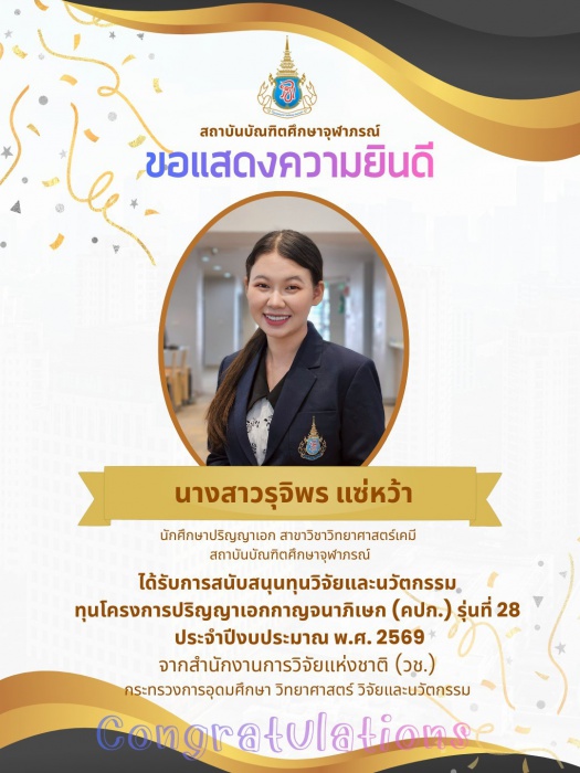 สถาบันบัณฑิตศึกษาจุฬาภรณ์ ขอแสดงความยินดีกับนางสาวรุจิพร แซ่หว้า นักศึกษาระดับปริญญาเอก สาขาวิชาวิทยาศาสตร์เคมี ได้รับสนับสนุนทุนวิจัยและนวัตกรรม ทุนโครงการปริญญาเอกกาญจนาภิเษก (คปก.) รุ่นที่ 28 ประจำปีงบประมาณ พ.ศ. 2569