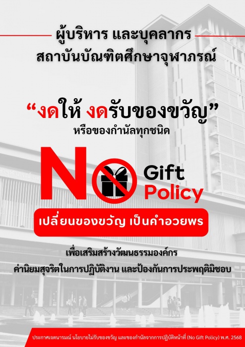 - ประกาศสถาบันบัณฑิตศึกษาจุฬาภรณ์ ลว 8 มี.ค. 65 เรื่อง นโยบายงดให้และงดรับของขวัญของกำนัลทุกชนิดหรือประโยชน์อื่นใดจากการปฏิบัติหน้าที่ (No Gift Policy)