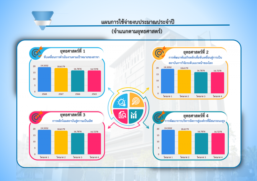| สถาบันบัณฑิตศึกษาจุฬาภรณ์ ได้กำหนดยุทธศาสตร์ของสถาบัน ฉบับที่ 2 ระยะเวลา 6 ปี ตั้งแต่ปี 2565-2570 ภายใต้ 4 ประเด็นยุทธศาสตร์หลัก และถ่ายทอดการปฏิบัติสู่แผนปฏิบัติการประจำปีงบประมาณ พ.ศ. 2568 ผ่านโครงการ/กิจกรรมต่างๆ ของสถาบันสู่การปฏิบัติจริง และจัดทำแผนการใช้จ่ายงบประมาณ พร้อมพิจารณาจัดสรรงบประมาณรายจ่ายประจำปีงบประมาณ พ.ศ. 2568 เพื่อเป็นกรอบวงเงินสำหรับปฏิบัติงานตามภารกิจให้บรรลุค่าเป้าหมาย ตัวชี้วัด ภายใต้เป้าประสงค์ของแผนยุทธศาสตร์ของสถาบัน ดังนี้ |
